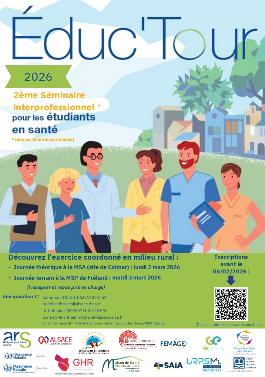 - Lundi 2 mars 2026, de 8h30 à 17h30 à la MSA de Colmar : ateliers interprofessionnnels autour de la prise en charge pluriprofessionnelle