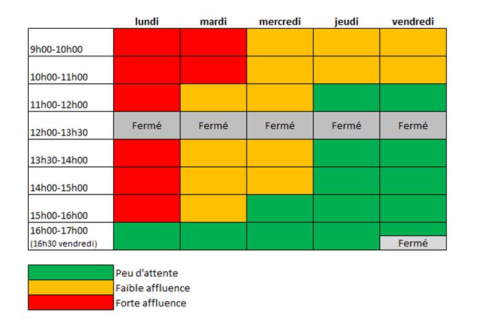 Du Lundi au jeudi de 8h30 à 12h00 et de 13h30 à 17h00 (16h30 le vendredi) Bon à savoirQuels sont meilleurs créneaux horaire pour nous appeler ? Cliquer ici pour afficher l'affluence des appels téléphonique par plages horaires |