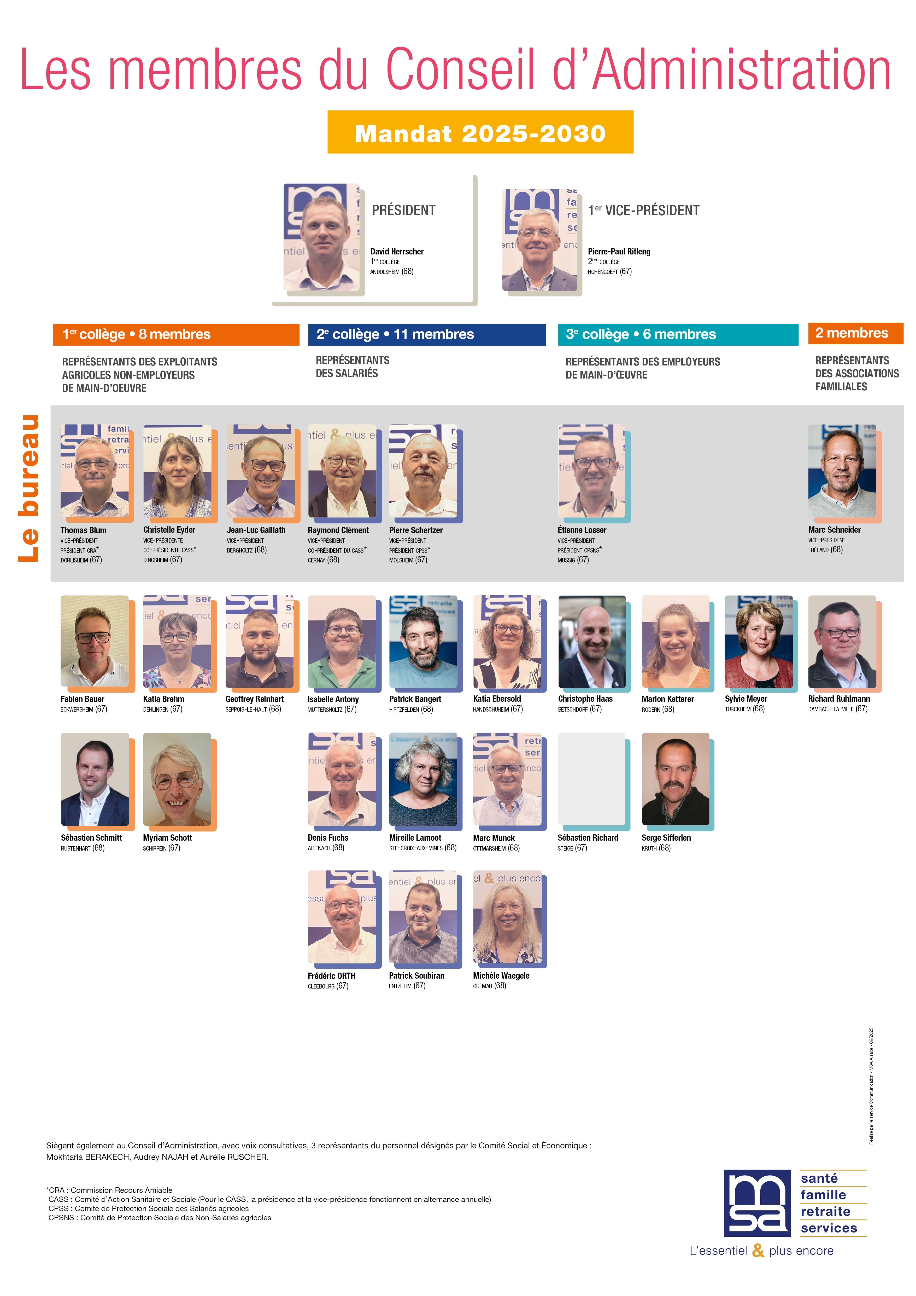 Le Conseil d'Administration de la MSA d'Alsace Mis à jour le 01/04/2026 Découvrez les membres du Conseil d'Administration, élus le vendredi 27 juin 2025 au Parc des Expositions de Colmar Partager : Partager sur Facebook Partager sur Twitter