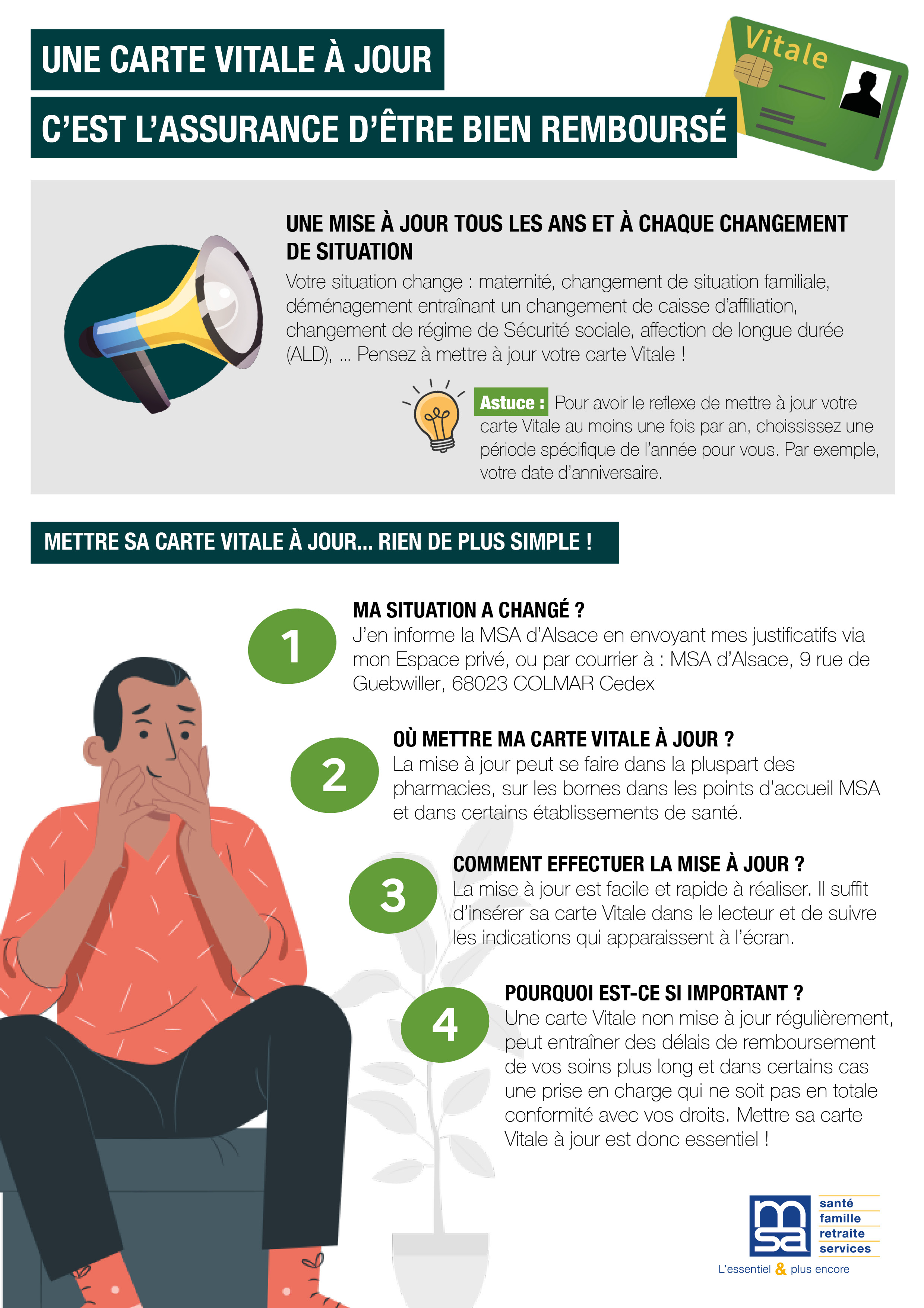Chez certains professionnels de santé, la présentation de la carte Vitale vous dispense de faire l'avance de frais sur la partie prise en charge par votre MSA. La somme restant à votre charge pourra éventuellement être remboursée par votre complémentaire santé.